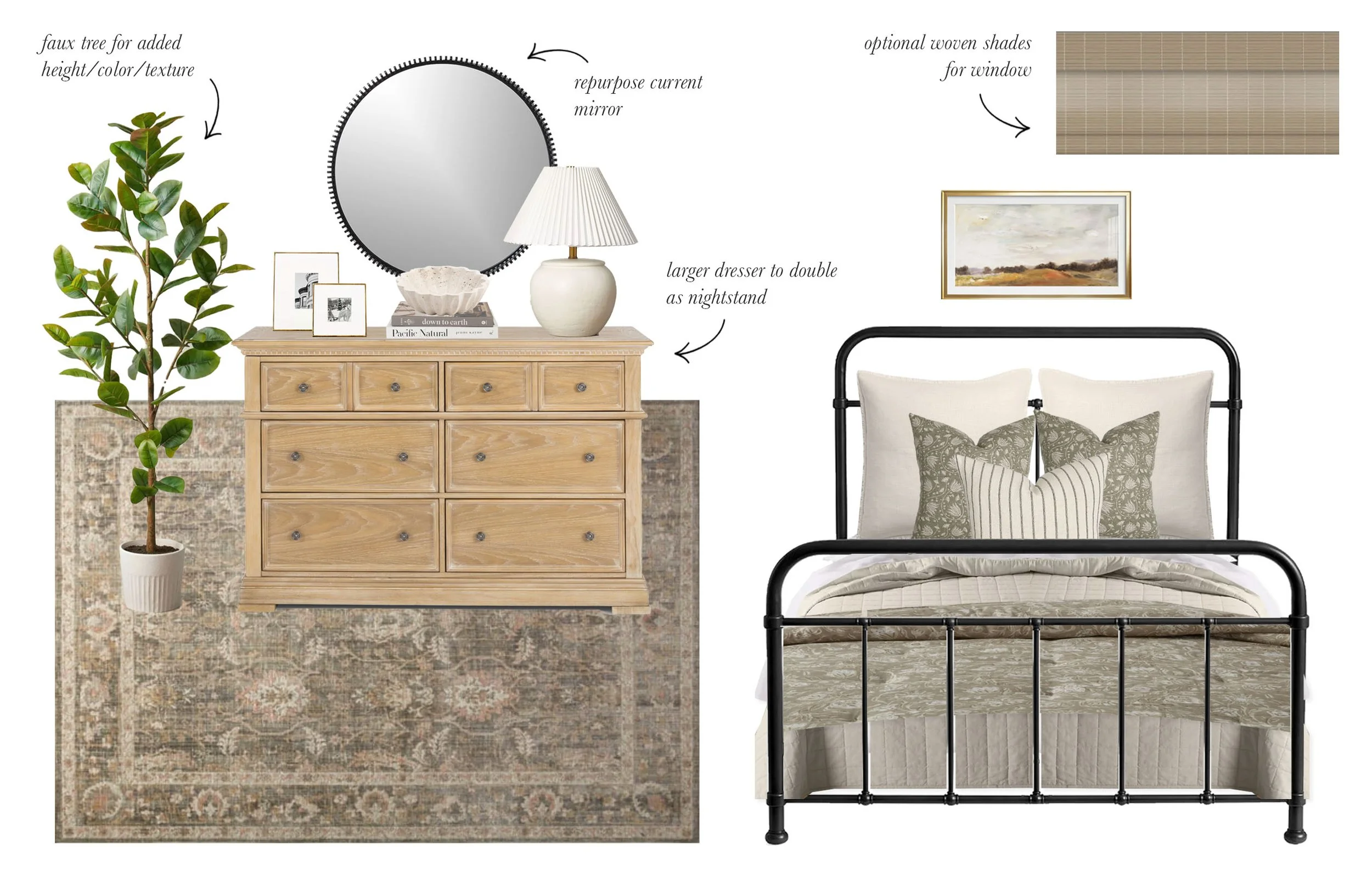 This client was looking to update her guestroom to feel more grown up and inviting while also functioning as her main “getting ready” space. She already had this classic metal bed frame to start (similar one here and here) as well as a newly purchased mirror (similar here), so it all came down to bringing in some warmth and texture through a new area rug, bedding and decor.