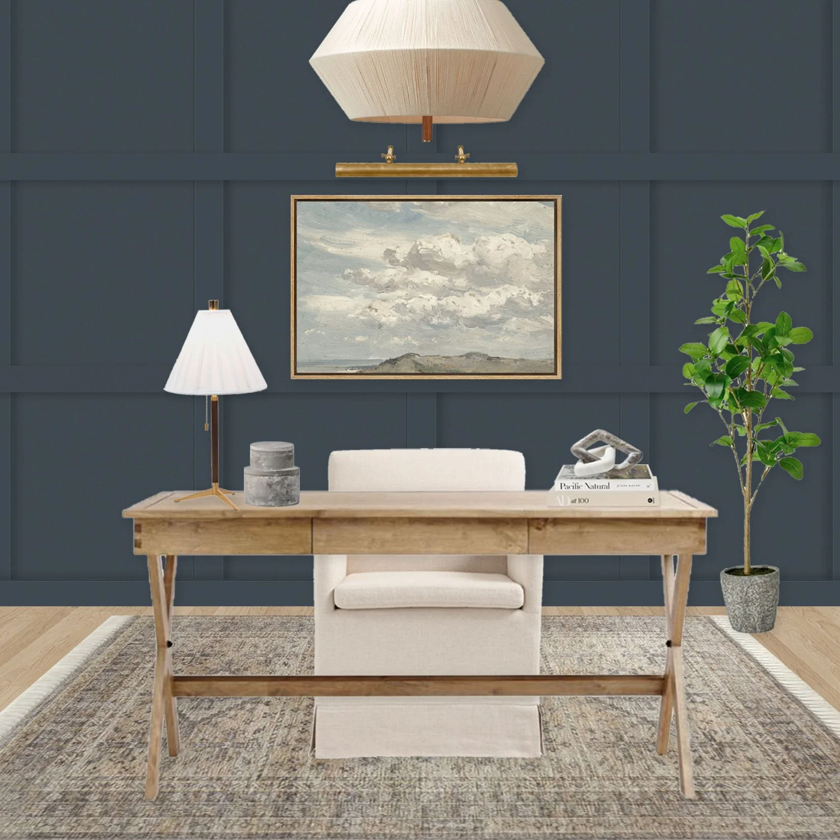 Mixing in lighter-tone wood finishes with organic materials like linen, marble and antique brass helps balance out the darker paint color for an overall look that feels fresh, inviting and ready for you to conquer the work day!